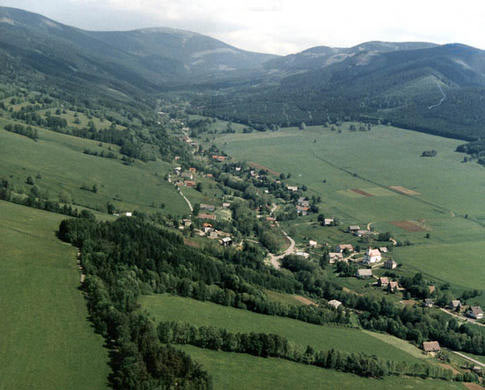 There it flows through villages named by the river - Horni Upper , Velka Great and Dolni Lower Morava. It s a beautiful view of the valley from the spring. Most of the tourists climb the near peak, where the ruines of the Polish tower still lie. The karstic caves called Tvarozne diry Curdy Holes are situated in the deep valley of Morava near the Vilemina hut. A nature trail leeds by the caves.