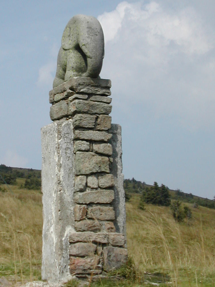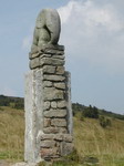 The loghouse at the spring of the river Morava has been teared down in 1971 for its poor condition. The tower on Polish side followed the loghouse s doom in 1973. The last lonely object still standing there is a small stone statue of an elephant. It s also damaged though. Ist tail has been broken. In time, the statue become a symbol of Kralicky Sneznik. Unfortunately, we don t know anything about the origin of the elephant statue. Perhaps a border stone, who knows? Just bellow the peak the river Morava springs. It s an often tourist s stop. From there Morava falls down the hill to a deep valley.